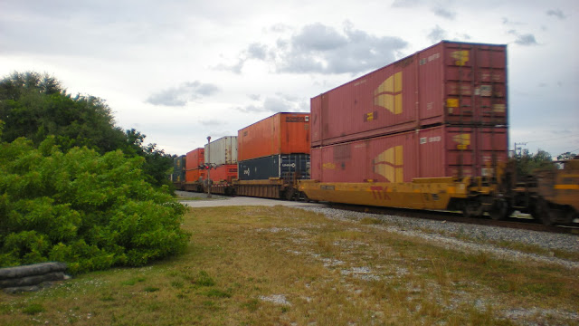 Sun hasn't shone its face all day but it was nice and cool outside to catch some trains. Watch SRHS( Sebastian River High School ) finish up their Powderpuff Parade, I looked at ATCS and judging the distance between FEC202-24 & FEC101-24, I had put my thumb on Micco, and sure enough, the dispatcher lines both trains to meet there. Gates come down as 710 is seen leading with ECH drumming on his chest on the 421 as they get prepared for the weekend. Rock on top with IM following as autoracks and tanks are seen on the bottom of this 9,500 foot train. EoT at 5:21PM. Meet doesn't take long at all as the green light pops on a lil ways south, signifying that that switch at Micco South is properly lined for FEC101-24. Bells ring as toots are given from the 107, 704 & Champion715 as IM is seen heading south to Miami. No ASHLEY seen here as the EoT passes me at 5:42PM.